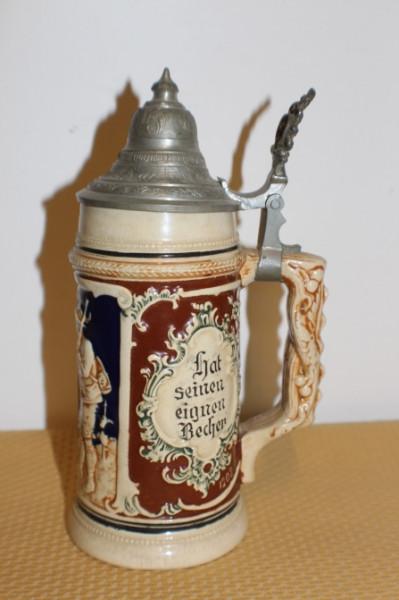 Steinzeug Krug Zinndeckel Monagram an Boden 0,5 Liter #5258 Menge: 1 Stück Zustand: gebraucht, ohne Beschädigung, Den Zustand entnehmen Sie bitte den Bildern Produkt: Sammelkrug Seidel Hersteller: Monogram am Boden Serie: 1202 Dekor: Alter: 20.Jh Maße ca. : D= 90/70 mm B= 120 H=160/210 mm Artikel: 5258 Preis: 28,- €